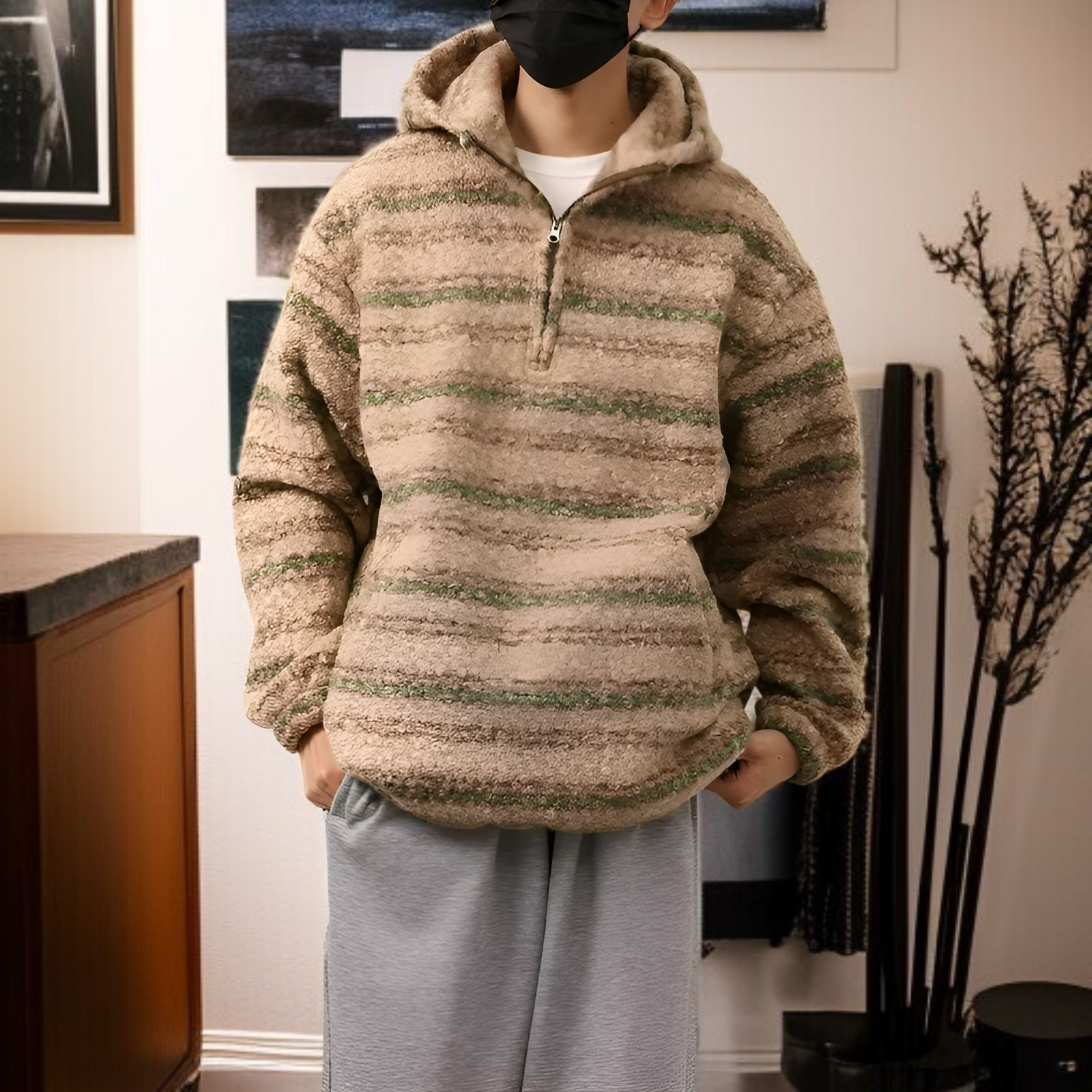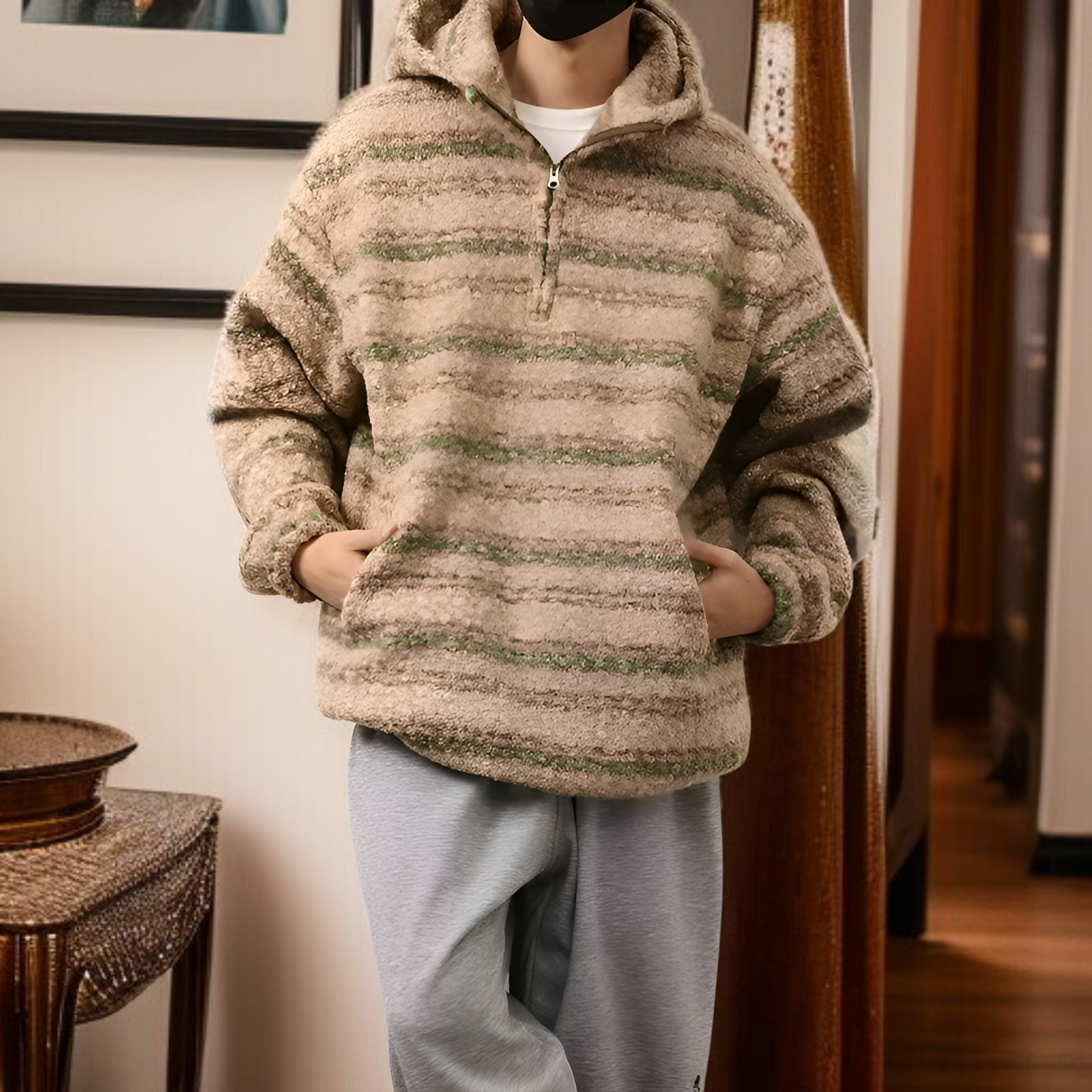 ● 2026年春夏新作、トレンド感溢れるストライプ柄が目を惹くメンズルーズウールコートで、洗練された大人の雰囲気を演出します。